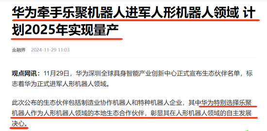 2024年11月29日,华为深圳全球具身智能产业创新中心正式宣布生态伙伴名单,标志着华为正式进军人形机器人领域。此次公布的生态伙伴包括制造业协作机器人和特种机器人企业,其中华为特别选择乐聚机器人作为人形机器人领域的本地生态合作伙伴,彰显其在人形机器人领域的自主发展决心。