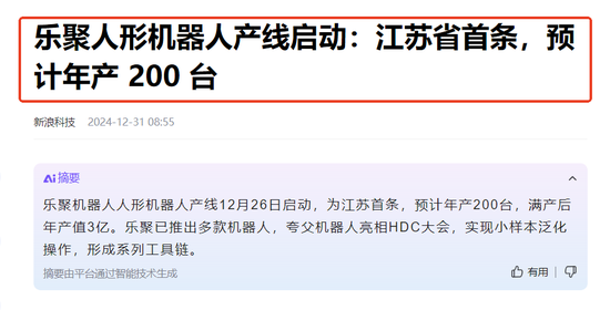 2024年12 月 30 日消息,乐聚机器人人形机器人产线 12 月 26 日正式启动,这是江苏省首条人形机器人产线,预计可年产 200 台人形机器人。此次启动的江苏省首条人形机器人产线项目,预计五年内达到满产,满产后年产值达 3 亿元。
